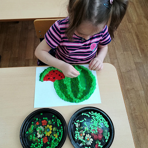 Поделка «Арбуз» стала результатом коллективного творчества. Для неё были предложены трубочки светло-зелёного цвета длиной 9 мм, тёмно-зелёного цвета длиной 7 мм и красного цвета длиной 5 мм. Это позволило наиболее точно передать внешний вид арбуза. Когда поделка была готова, дети отметили её необычность из-за получившегося эффекта объёма, известного современным дошкольникам как «3D эффект».