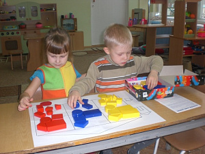 Строится «район» больших и «район» маленьких домиков. В каждом районе – улицы разного цвета. И сами блоки «домики» имеют разную форму. Даётся задание, например, найти прямоугольный домик в районе маленьких домиков, на красной улице. Четырёхлетки с интересом гуляют по такому городу, выделяют, сразу три свойства фигур.
