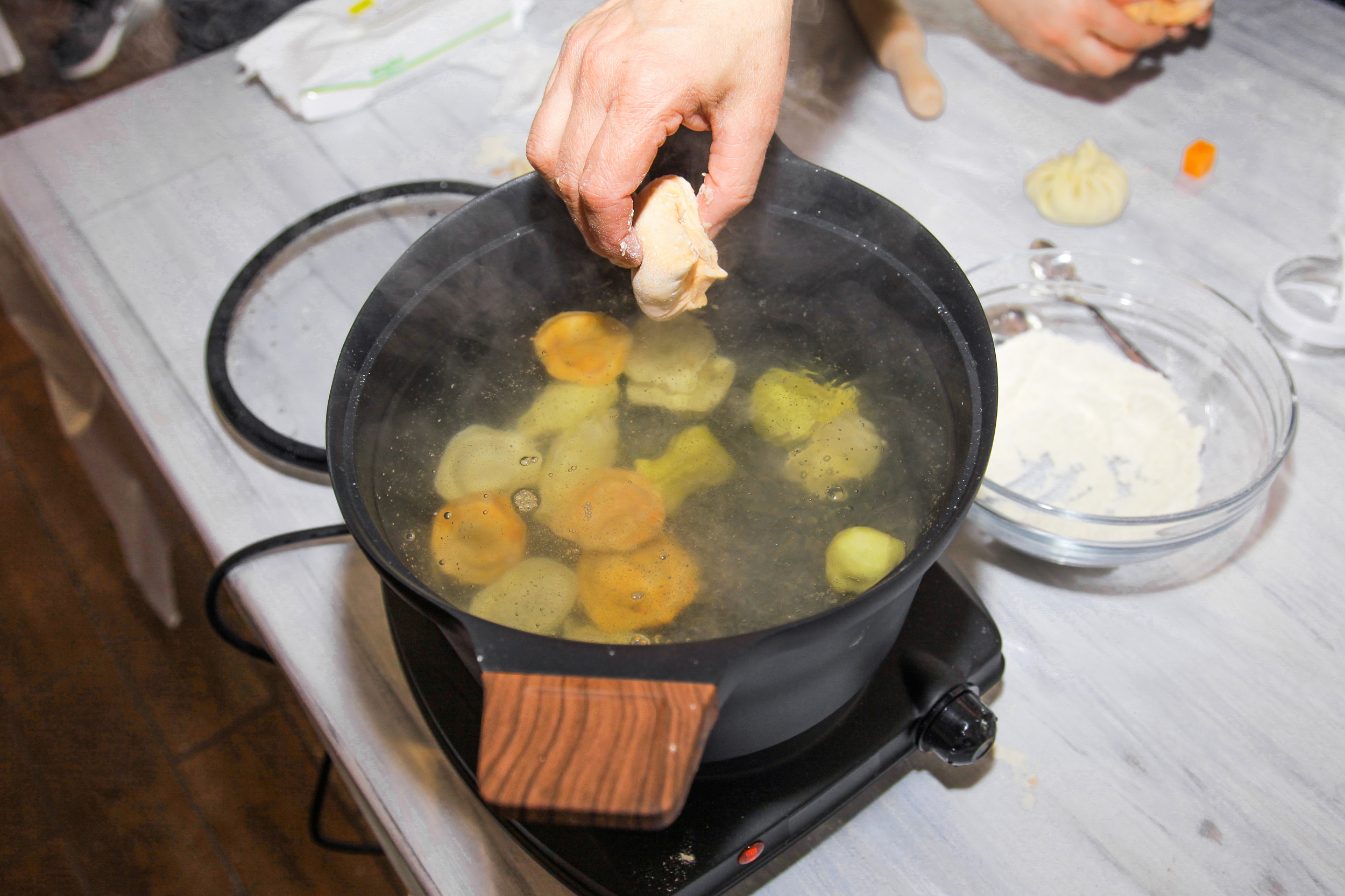 На мастер-класс шеф-повара ресторана «Ути-Пути» пришло звёздное семейство – Елена Борщева со старшей дочерью Мартой. Участники с большим воодушевлением принялись замешивать тесто. В качестве красителей использовались натуральные ингредиенты – куркума и паприка, придавшие заготовкам тёплые цвета, которые гости прозвали «марсианскими». Подход к лепке был творческим – полуфабрикаты получались самых причудливых форм: кулёчки, конвертики и мини-пирожки. Пельмешки Марты превращались в хинкали. Кроме того, самая юная участница мероприятия не побоялась экспериментировать с начинкой, добавляя в неё разнообразные ингредиенты. «Пельмени по-гречески», – прокомментировала Елена Борщёва экспериментальный вариант пельменя с индейкой и оливкой.