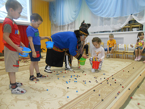 Воспитатель: Хорошая хозяйка чума летом обязательно собирает ягоды. Какие ягоды растут у нас в тундре? (Ответы детей, педагог показывает картинки с изображением ягод, уточняя цвет и размер.) Молодцы! Сегодня вы тоже будете собирать ягоды. (Воспитатель раздаёт ведёрки.) У вас в ведре находится по одной ягодке, вам надо собрать такие же и как можно быстрее. (Подвижная игра «Сбор ягод». На полу рассыпаны бутафорские ягоды: голубика, черника, психа, брусника. Собирают на скорость по два человека с каждой команды.)