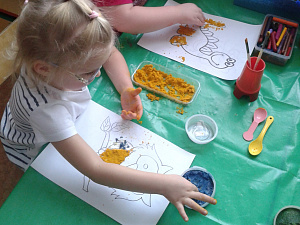 - окрашиванием разных видов соли гуашью, акварелью, растолчёнными мелками; выяснением, чем окрашивать легче, удобнее, интереснее, быстрее;