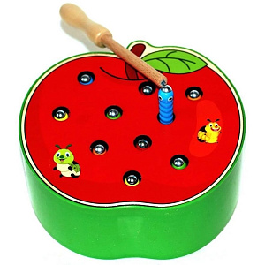 Эта игра относится к серии магнитных рыбалок, хотя идея более креативная. Несмотря на указанный производителем возрастной диапазон 3-5 лет, игра вызывает интерес у детей ещё до наступления 1 года. Игрушка-коробка выполнена в виде яркого яблока, на поверхности которого много отверстий для милых и забавных червяков. В комплекте с яблоком имеется небольшая удочка, с помощью которой ребёнок вылавливает червяков. На голове у каждого из жителей яблока – металлический наконечник, магнитящийся к удочке.