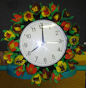Воспитатель: Ребята, скажите, из какого материала мы с вами делали цветы? (Ответы детей.) Теперь мы знаем, что из яичных упаковок и другого бросового материала можно красиво оформить не только наши часы, но и создавать другие интересные поделки. Давайте повесим часы на стену и будем любоваться ими.