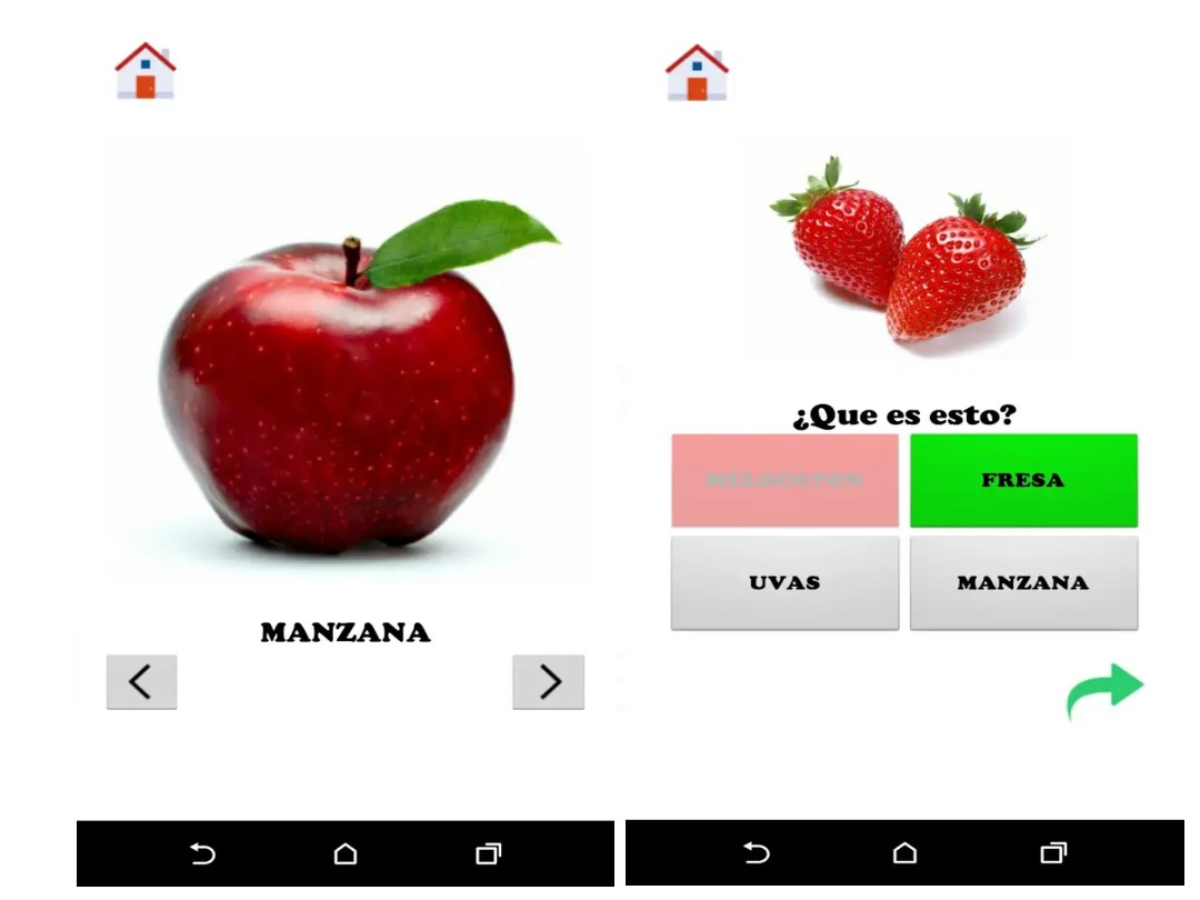 Аннотация этого приложения, как и предыдущего, объясняет, что с помощью игры дети узнают основные испанские слова. Главная страница даёт выбор трёх уровней: «Обучение», «Игра 1» и «Игра 2» - слова написаны на испанском языке. Уровень «Обучение», в общем, мало отличается от того же уровня в первом приложении, разве только здесь не написано слово по-русски. Первая игра предлагает ответить на испанский вопрос диктора «Что это такое?». При этом называется слово и необходимо нажать на одно из предложенных на экране изображений. При правильном ответе осуществляется переход к новому вопросу, при ошибочном - перехода нет. Вторая игра с помощью того же испанского диктора задаёт вопрос типа «Где среди картинок лошадь?». И вновь четыре картинки, при верном ответе - переход к следующему заданию, при неправильном - игрок остаётся здесь же. Игра предлагает изучение слов следующих лексических тем: звери, цифры, фрукты, овощи, цвета, инструменты, транспорт, профессии, глаголы, школьные принадлежности.