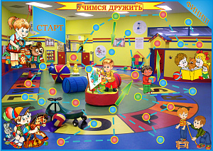 На столе разложены красные и синие карточки. Первый игрок кидает кубик, делает ход и, в соответствии с цветом поля, на которое он попал, берёт карточку. Педагог зачитывает задание, написанное на обратной стороне карточки, ребёнок его выполняет. Возможно коллективное обсуждение ответа на вопрос. Затем ход переходит к следующему игроку. Игра продолжается до тех пор, пока один из игроков не дойдёт до финиша.Вопросы на красных карточках:
