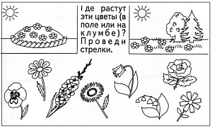Каждому участнику раздаётся рисунок с изображением цветов. Дети должны распределить их на две группы: цветы, которые растут в поле, и цветы, которые растут на клумбе.