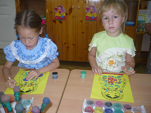 Тема занятия — роспись сарафана для матрёшек. И страх испачкать руки исчез после первого же занятия. Дети с удовольствием макают один палец в красную краску, другой — в синюю, третий — в зелёную. В результате у всех, кто рисовал, всё получилось. Боязнь «не умею», «не могу» побеждена! Каждое занятие удивляет детей новизной и неожиданным решением.