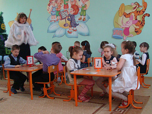 Фея: Чтобы поиграть в эту игру, приглашаю всех за столы. На каждом столе карточки с цифрами и карточки изображениями овощей, фруктов, домашних и диких животных. Нужно взять карточку с картинками, сосчитать их количество и выбрать цифру, которой можно обозначить это число. Потом назвать количество предметов, добавив слово-признак. Например: четыре пушистых котёнка, две рогатые коровы. (Провожу с детьми речевую игру «Сосчитай, не ошибись» на согласование словосочетаний из прилагательного и существительного с числительным.)