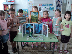 Воспитатель: Верно. Малахит прославил Урал на весь мир, потому что в нашем крае были самые большие залежи этого камня. Молодцы, справились и с этим заданием. В награду 6-й камень. Только вот для чего человек использует самоцветы? (Ответы детей.) Из самоцветов делают различные украшения, шкатулки, рамки для картин. (Рассматривание украшений). 7-й камень в награду за ваши знания о самоцветах. А ещё Урал знаменит изделиями из бересты и камней самоцветных. (Демонстрация картин.) Они не нарисованы, на срез дерева наклеена каменная крошка.