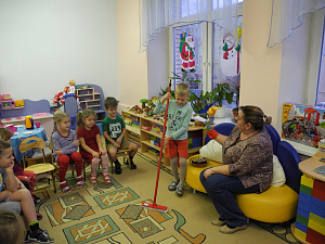 Воспитатель: Дети, такой щёткой можно чистить зубы? (Нет, этой щёткой надо пол подметать). Серёжа, покажи, как подметают пол щёткой. И мы с вами ребята все встанем и покажем. (Дети имитируют движения.) Скажите ещё раз Петрушке, какая это щётка (Половая). Очень хорошо можно маме помочь с этой щёткой: подмести, чтобы ни соринки не было.