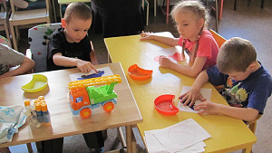 Воспитатель: Молодцы, девочки! Верно (игрушку-отгадку дети достают из коробки). А кто играет с машиной? (Ответ детей.)