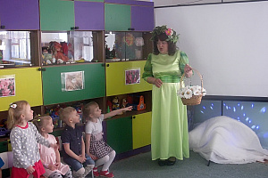Воспитатель: А какой у нас сейчас месяц? (Апрель). Правильно, а вы любите путешествовать? Я предлагаю Вам побывать в гостях у весны, но для этого вам надо сесть на стульчики, закрыть глаза и внимательно слушать весенние звуки. (Звучит весенняя музыка. Воспитатель накидывает наряд весны. Музыка останавливается, дети открывают глаза, слайд №1.)