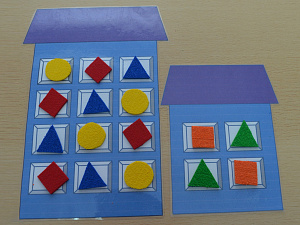предлагается заселить геометрические фигуры, например, два треугольника и два квадрата в домик с четырьмя окошками таким образом, чтобы две одинаковые фигуры не располагались рядом по соседству. Далее ребёнку предлагается домик с девятью окошками (соответственно количество фигур может быть следующее: три круга, три квадрата и три овала), затем с двенадцатью и шестнадцатью.