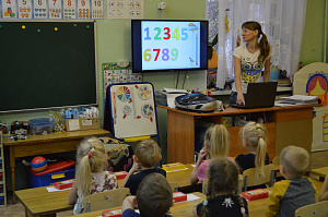Воспитатель: Сегодня мы познакомимся с составом числа 10 и цифрой 0. (Проводится игровое упражнение «Назови число», цифры изображаются на экране.) Ребята, посмотрите на экран и посчитайте цифры. (Дети считают.) Как по-другому ещё можно посчитать эти цифры?
