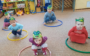 Воспитатель: Дети, а в мешочке ещё что-то есть. Посмотрим-ка, что там? (Достаёт маски лягушек.) Тоже лягушки. А маски одинаковые или разные? (Разные.) Чем же они отличаются? (Показывает большую маску.) Это маска какая? (Большая.) А эта? (Маленькая.) Большая маска – это мама-лягушка, а маленькая – это маленький… Кто? (Лягушонок.) Что делают лягушки? (Квакают.) А вы умеете квакать? (Ква-ква.) Давайте поиграем все вместе. (Проводится игра «Угадай, кто квакает». Воспитатель надевает маски, условно разделяя детей на 2 группы: мамы-лягушки и лягушата.)