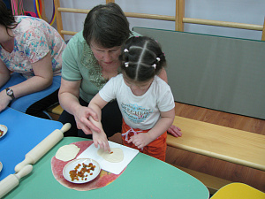 Перед родителями и детьми лежат дощечки со слоёным тестом. Всё готово для того, чтобы испечь пирожок — раскатать тесто скалкой, положить начинку (изюм), разложить свои пирожки на общий поднос.Воспитатель. Мы отдадим наши пирожки кошечке, она их испечёт и покормит своих котят. А теперь можно поиграть ещё и с кошечкой. Киска любит играть с клубочками, давайте и мы поиграем.