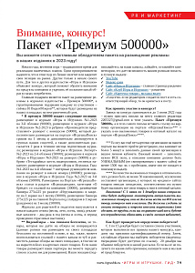 *В премиум 500000 входят следующие позиции: размещение в журнале «Игры и Игрушки» №1-2023 на 3-й обложке (90000), размещение в журнале «Игры и Игрушки» №2-2023 в рубрике «Производители представляют» разворот с конкурсом (50000), который дополнительно размещается на портале «ИгрушкаПоиск» сроком на 1 месяц и дополнительно анонсируется в группах наших соцсетей, а также дополнительно рассылается 2 раза в течении месяца подписчикам журнала; размещение в журнале «Игры и Игрушки. Эксперт» №2-2023 на 2-й обложке (50000); размещение в журнале «Игры и Игрушки» №3-2023 на разворот (50000) в рубрике «Тестдрайвы» шесть видеороликов, отснятых накануне; размещение в журнале «Игры и Игрушки. Гид» №1-2023 на 4-й обложке + интервью руководителя компании на разворот в начале номера (100000); размещение в журнале «Игры и Игрушки. Гид» №2-2023 на 3-й обложке (50000). Размещение на Портале «ИгрушкаПоиск» статьи в разделе «Игрушкапедия», категория «О бренде» со ссылкой на компанию (30000), размещение баннера 275х225 рх разделе «Игрушкапедия» в закрепе на 1 экране на 1 месяц (30000), размещение баннера 275х225 рх на главной Портала под слайдером в 1 экране (рандомно) на 1 месяц (50000).