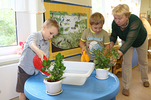 Воспитатель. Вода дала жизнь этим листочкам. А что мы делаем, чтобы наши цветы были такие красивые, цветущие?