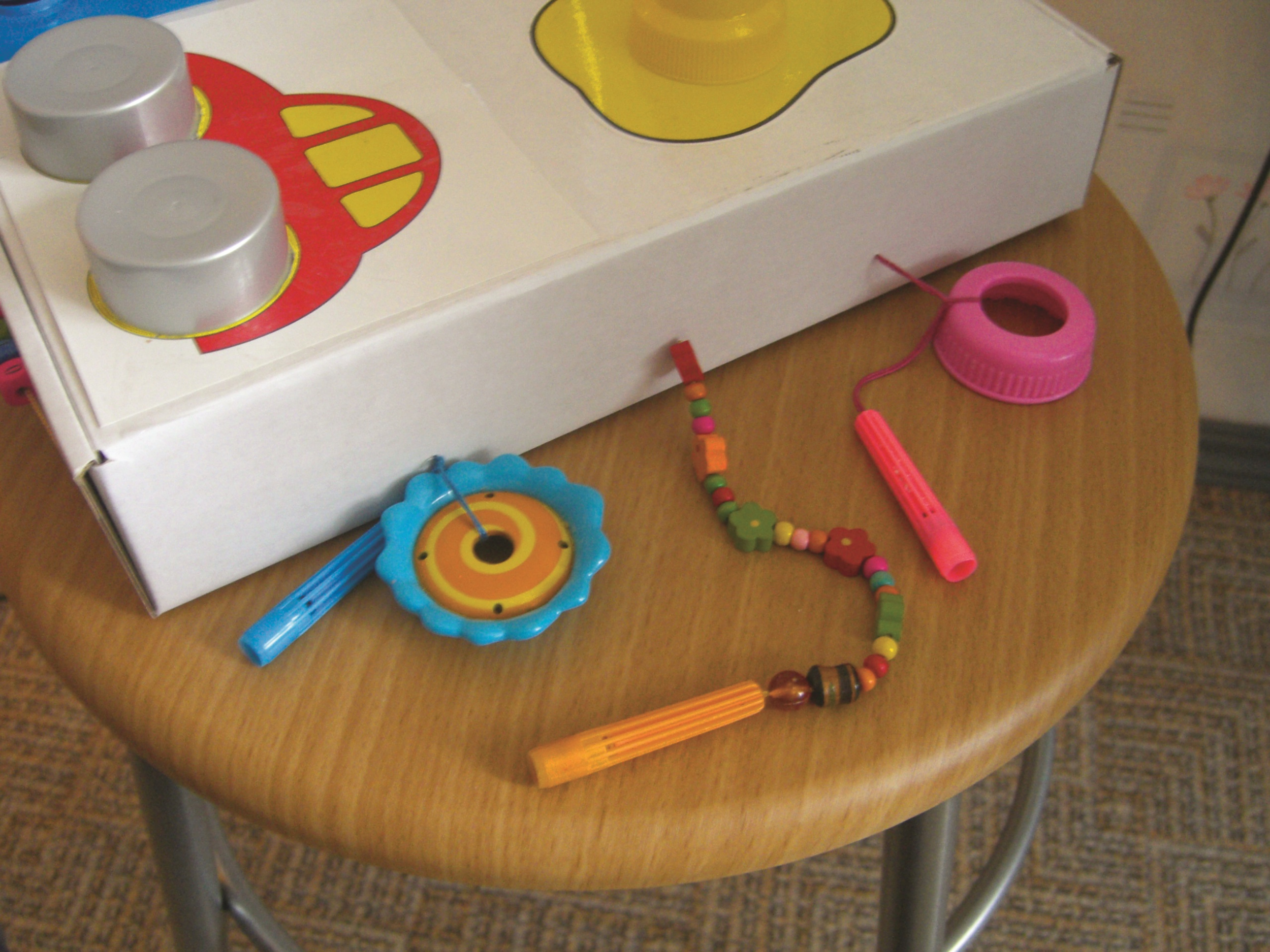 Чтобы место по бокам коробки не пустовало, я придумала «дергушки» — сделала ниточки (использовала нитки «Ирис»), на них нанизала бусины, кружочки от детских бутылочек, которыми мы уже не пользуемся, на концы надела колпачки от фломастеров. Чтобы закрепить всё это, использовала обычные бубенчики, которые продаются в отделах с товарами для рукоделия, привязала их на концы ниток и втянула в колпачки, таким образом, и ниточки спрятались, и колпачки теперь звенят.