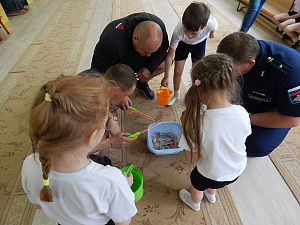 Конкурс «Рыбалка». Дом построили, мусор убрали, бельё перестирали. Пришло время отдохнуть, и ведущий предлагает папам отправиться с детьми на рыбалку. В центре зала большой таз с рыбками на магнитах. У пап в руках удочки, у детей ведёрки. По команде папы и дети «ловят» удочками рыбу и складывают улов в ведёрки. Побеждает команда, наловившая за 2 минуты больше рыбы.