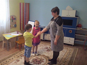 Педагог: Если я хлопну в ладоши один раз, вы поздороваетесь за руку, два – коленками, три – спинами. (Включается фонограмма логоритмики «Пятнышки» Е. Железновой. Дети выполняют движения в соответствии с текстом.)