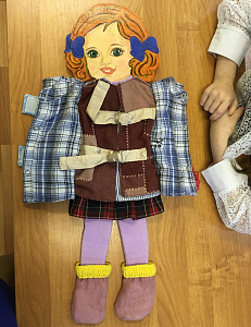 Описываемое пособие представляет собой куклу из фанеры и предметы одежды с разнообразными застёжками: пуговицами, молниями, кнопками, липучками, ремешками, бантами, шнурками, крючками и булавками. С помощью учебного набора дети осваивают и закрепляют умение в правильной последовательности одевать и застёгивать одежду сначала под руководством педагога, а затем самостоятельно. Осваивая механизм каждой застёжки, ребёнок учится целеполаганию и нахождению способов достижения цели, самоанализу, самоконтролю и коррекции собственных ошибок. Например, пуговица не пролезает в петлю, молния не застёгивается, шнурки не завязываются – ребёнок сам подбирает необходимый способ решения задачи, что способствует формированию регулятивных универсальных учебных действий в соответствии с требованиями ФГОС.