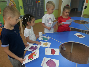 Воспитатель: Наступило время обеда, и друзья проголодались. Но они не взяли с собой продукты! Пришлось им искать еду. Кот Матроскин нашёл много съедобных предметов овальной формы. Что это может быть? Какие блюда мог приготовить Матроскин? (Дети играют с «Логоформочками».)