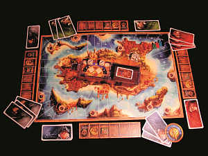 Компас для первого игрока, 12 карт сокровищ, которые могут как помочь игроку, так и наложить на него проклятье. Тут есть и дополнительное отделение к вашему трюму, и мощная пушка, и секретная карта. И, конечно же, сокровища! Всё это хранится в сундуках, жетоны которых будут распределены на игровом поле в специальных областях.