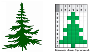 Прошлое занятие было посвящено знакомству с кодировкой шифра японского кроссворда. Для постепенного привыкания использовался упрощённый вид этого шрифта, понятный даже дошкольникам, умеющим немного считать. Во «взрослом» японском кроссворде всё сложнее: цифры фона не указываются, и подобный кроссворд предстаёт уже совсем в другом виде. В качестве примера рассмотрим монохромный кроссворд «Ёлка», выполненный зелёным цветом на белом фоне (Рис. 1).Цифра 1 в первой строке означает, что в ней только одна клетка рисунка; цифры 1 и 2 во втором столбце – что в этом столбце находятся два элемента рисунка: один, верхний, состоит из одной клетки, а другой, расположенный ниже (но не соприкасающийся с верхним; иначе вместо цифр 1 и 2 в этом столбце стояла бы цифра 3 – сумма этих цифр), из двух.