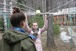 Приготовив круг диаметром 40-50 см из плотного картона, верёвки и теннисный мячик (жёлтый) можно поиграть с детьми в игру под названием «Солнышко». Верёвки привязываются к кругу как лучики у солнышка. Каждый ребёнок берёт по одной верёвке в каждую руку. Задача детей, молча, перенести теннисный мячик с одной точки на другую (на расстояние примерно метра два). Для ребят постарше можно усложнить задание, например, удлинив трассу или подготовив им препятствия. Как только мячик падает, всё начинается сначала, то же самое касается разговоров.