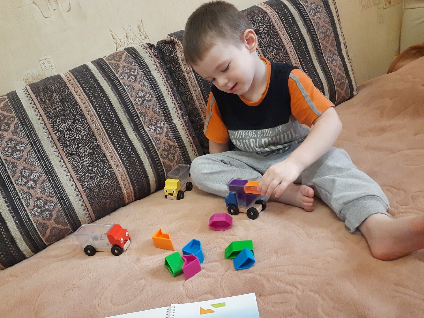 На тот момент Артёмке было только 2,5 года, и я долго раздумывала, будут ли они ему сейчас интересны. Но они настолько запали мне в душу и, учитывая то, что игры для сына я всегда стараюсь выбирать с правильной смысловой нагрузкой, всё-таки решила их приобрести. С тех пор я ни разу не пожалела. Да, поначалу сынок просто катал эти машинки, но уже месяца через три стал с интересом выполнять задания. Смысл игры в том, чтобы загрузить в прозрачный кузов грузовика детали так, чтобы не осталось пустого места. Задачка не из лёгких, даже взрослым есть над чем подумать!