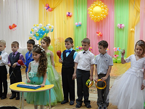 Муз. руководитель: Молодцы, первое задание выполнили. Скажите, кто доносит до слушателей музыку, которую сочинил композитор? (Дошкольники называют музыкантов.) Правильно, музыканты. Одни из них играют на инструментах, другие поют. Если музыкантов много, то получается… (Дети называют оркестр и хор.) Верно. И оркестром, и хором руководит дирижёр. Сейчас мы с вами организуем свой оркестр. (Дети выбирают дирижёра и разбирают бубны, маракасы, колокольчики, треугольники. Педагог исполняет мелодию, дети под управлением дирижёра вступают и заканчивают свою партию.)