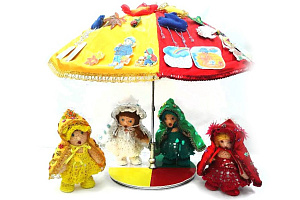 Цель: научить детей ориентироваться в сезонных изменениях. Закреплять навыки классификации, развивать наблюдательность. Активизировать речь и память детей, увеличивать их словарный запас.Материалы: разноцветный зонт, разделённый на 4 части; 4 цветные пластины; 4 куклы, одетые в разноцветные плащи в соответствии с временами года (жёлтый, белый, зелёный, красный), платье, шапочки, туфельки, соответствующие определённому времени года, 4 разноцветные корзиночки, плоскостные картинки, обозначающие приметы времени года.