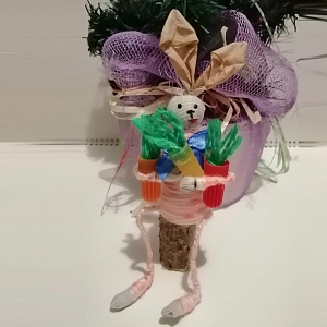 Зайку каждый может нарядить или украсить на свой вкус. Своему зайке я сделала морковки. Основание морковки – это колпачок от фломастера, ботва – это пряжа зелёного цвета. Всё соединила с помощью клея. Получился новогодний сувенир. Нашла маленький пенёк и посадила его под ёлочку. Если привязать ленточку к ушкам зайки, то это будет отличная ёлочная игрушка.