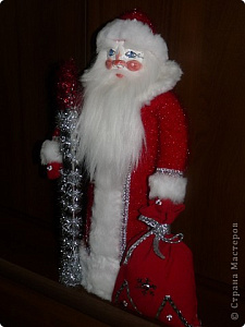 - Наша «заготовка» высохла, и теперь начинается всё самое интересное: роспись лица, подготовка наряда, посоха и мешка с подарками. Глаза, щёки, нос, губы рисуем гуашью и покрываем лаком. Бороду и брови делаем из кусочков искусственного меха. Шубу можно связать или сшить по принципу «реглана». Для украшения используем различную фурнитуру (новогодние снежинки-блёстки, стразы, тесьму и т.д.). Посохом может стать трубка, обклеенная блестящей самоклейкой и мишурой.