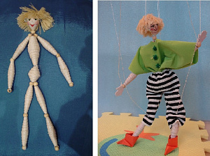Вот и готова наша кукла-марионетка! Она может ходить, садиться, поднимать ту или другую руку, поворачивать голову, наклоняться. Попробуйте привести в движение куклу колебательными движениями вправо, влево, вперёд назад, перетягиванием ручной, височной нитей. Следует избегать приводить в движение одновременно все сочленения куклы.