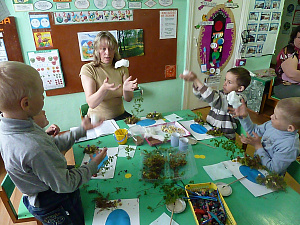 Педагог. Давайте возьмём в коробочке мох и сделаем круглую поляну. А находиться она будет в левом нижнем углу, то есть слева от озера. Покажите, где будет цветочная поляна? (Дети показывают.) Молодцы, правильно! А теперь пальчики ваши пусть немного «погуляют» между травами: сначала быстро, а потом медленно. Давайте ладошкой потрогаем нашу траву на поляне. Какая она? Что про неё можно сказать? (Шершавая, мягкая, приятная, зелёная, засушенная.)