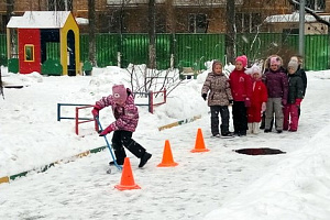 Предлагаю ответить на вопросы: Зачем нужен мяч? В какие игры можно играть с ним зимой? В это время воспитатели расставляют на дорожке по 3 конуса в ряд для каждой команды. Предлагаю посоревноваться в ловкости.Проведи мяч клюшкой. Дошкольники по очереди проводят мячик клюшкой между конусами, двигаясь «змейкой» вперёд, и так же возвращаются к команде. Побеждают ловкие, быстрые и дружные.