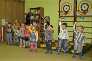 Ножками потопаем (делают 4 притопа). (Дети в кругу выполняют упражнение, чётко проговаривая слова.)