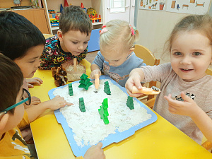 Педагог: Правильно. Песок белый и похож на снег. Давайте сделаем снегопад. (Каждый ребёнок поочерёдно берёт горсть песка и аккуратно щепоткой сыпет на поверхность левой и правой рукой. В это время звучит детская песенка.) Посмотрите, как красиво получилось, как сверкает снег. А теперь мы поставим ёлочки. (Педагог предлагает детям вставить в песок ёлочки.) Ёлочек много. Получился зимний волшебный лес.