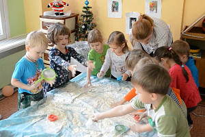В нашем городе на берегу Чёрного моря дети редко могут увидеть снег, поэтому для ознакомления их с зимними явлениями в природе и для создания «зимнего» настроения был разработан конспект НОД с использованием муки как напоминающего снег белого сыпучего материала. Для повышения заинтересованности детей в деятельности, мы использовали простые приёмы рисования пальцами на муке, выполнение отпечатков на муке формочками для песка, засыпание «снегом» предметов, а также возможность представить себя лёгкими нежными снежинками и выразить свои эмоции в танце.