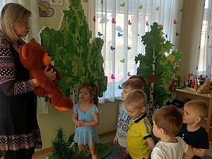 Медведь: Здравствуйте ребята! Я долго наблюдал за вами, и вы мне понравились. Вы все ходили в лес, не ломали веток, никого не обидели, только помогали. Я принёс вам шишки, целую корзину, с ними можно играть. (Отдаёт корзину воспитателю.) С такими хорошими ребятками я хочу поиграть. (Проводится игра «Как-то мы в лесу гуляли» - медведь притворяется спящим, дети проговаривают игровой зачин, приближаясь к медведю. На словах «Ну-ка, мишенька, вставай!» медведь догоняет детей.)