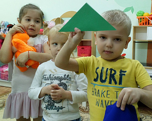 Воспитатель: Правильно! Но как вы его узнали? Проведите по краям треугольников пальцами. (Педагог подводит детей к выводу о том, что у этой фигуры есть три гладкие стороны и три угла. Дети их показывают и ощупывают треугольники.)