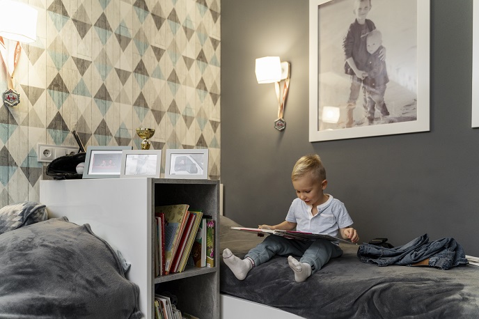 Организация домашней библиотеки для ребёнка по Монтессори – это организация пространства, где малыш может самостоятельно выбирать себе книгу, читать её и возвращать на место. В этой зоне должны быть открытые полки для хранения книг, до которых дети могут легко дотянуться. Поставьте рядом с книжной полочкой аксессуары для чтения (кресло, пуфик, настольная лампа) и постелите мягкий коврик для комфорта детей. Меняйте ассортимент книг раз в неделю, или чаще, если ваш ребёнок много читает.