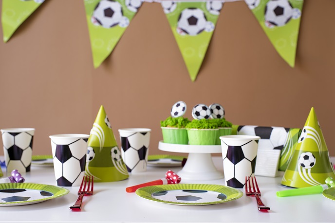 Для оформления праздничного помещения вам понадобятся зелёные и чёрно-белые шары, шары в виде мячей, растяжки, флажки, плакаты известных футболистов, ростовые куклы, тантамарески, всевозможные кубки, шапки болельщиков, шумелки и баннеры. Для сервировки стола пригодится одноразовая посуда, скатерть зелёного цвета, столовые приборы, топперы и ярлычки на сладости, наклейки на бутылочки с водой с соответствующим тематическим принтом (напиток чемпиона или сок чемпион).