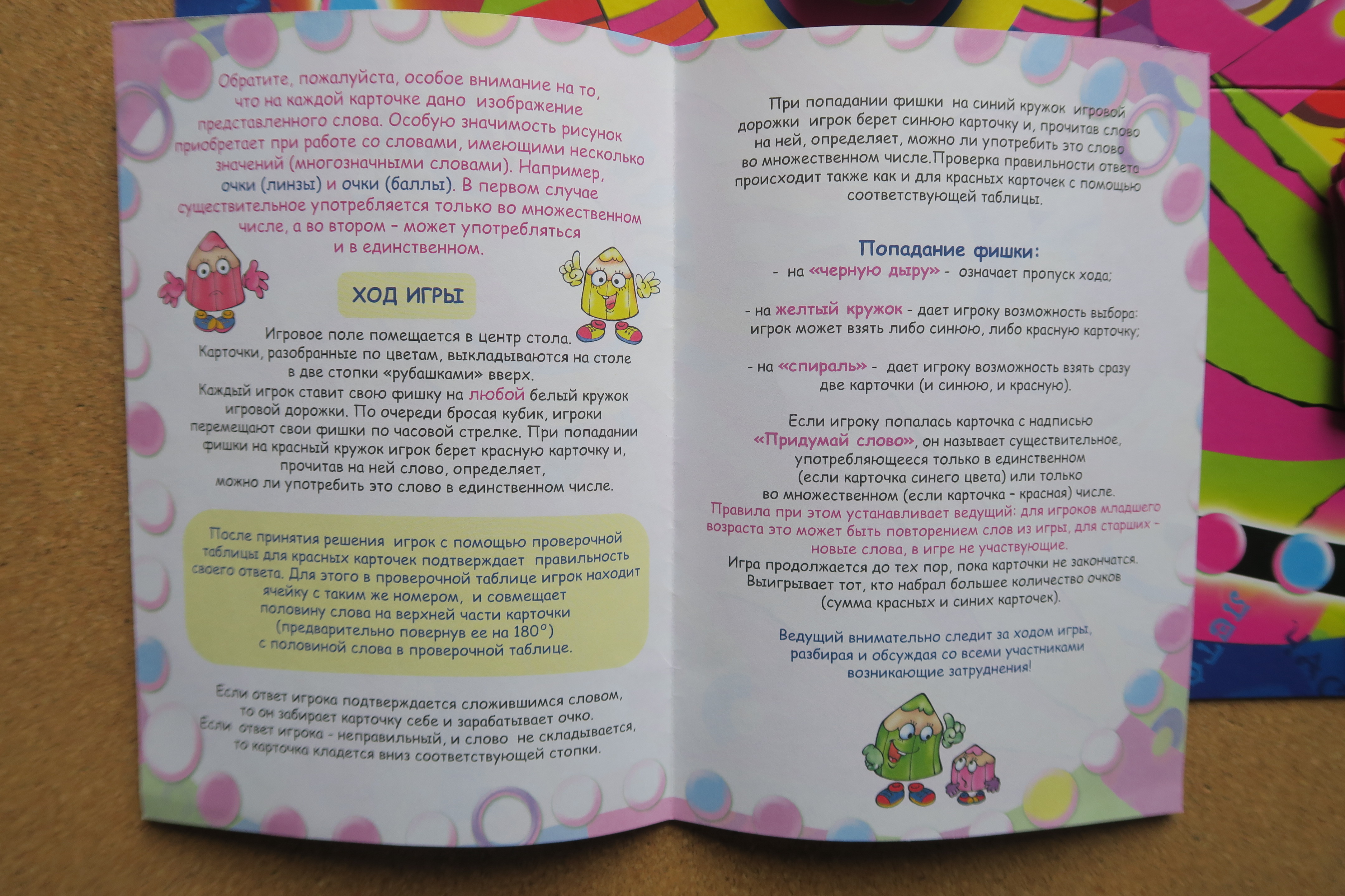 Внутри коробки: инструкция, складное яркое игровое поле, которое не имеет конца и начала, 45 синих и 45 красных карточек с картинками с написанными существительными в единственном и множественном числе, плюс дополнительные карточки "придумай слово", две карточки для проверки слов, кубик и 4 фишки.