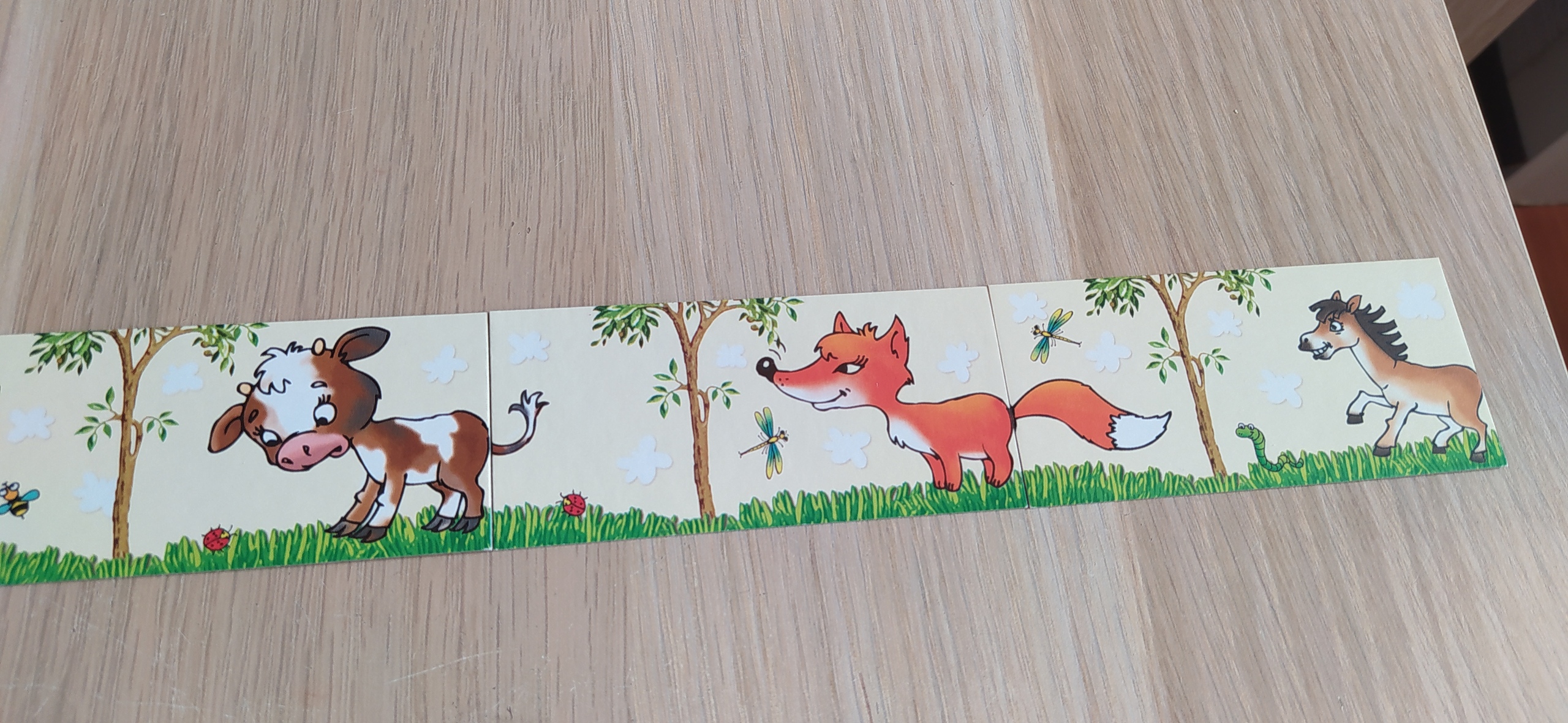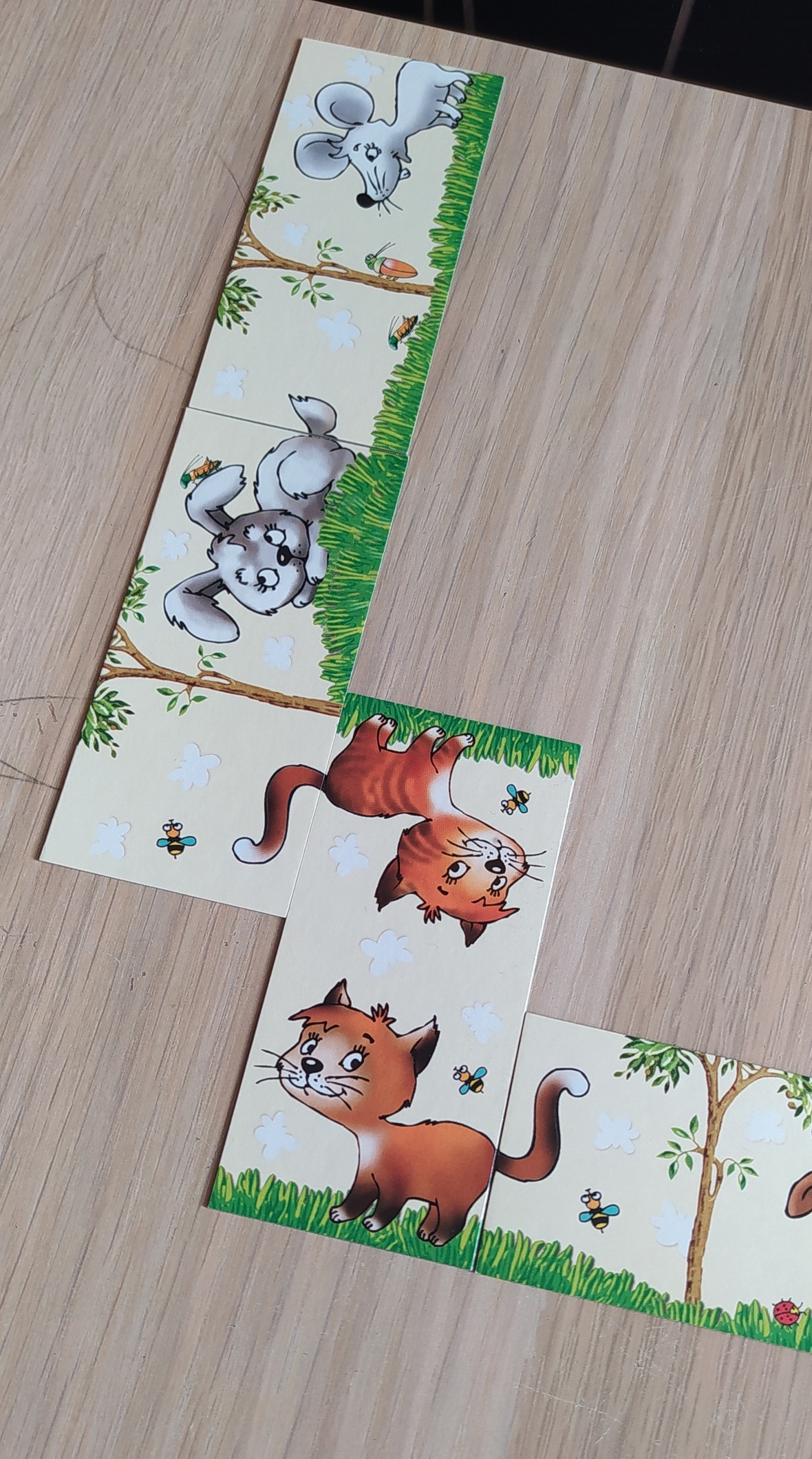 - Классическое домино. Ищем нужный хвостик. На каждой карточке есть подсказки, если найти нужный хвост не получается, около животного должны быть две одинаковые бабочки, два жучка или два червяка.