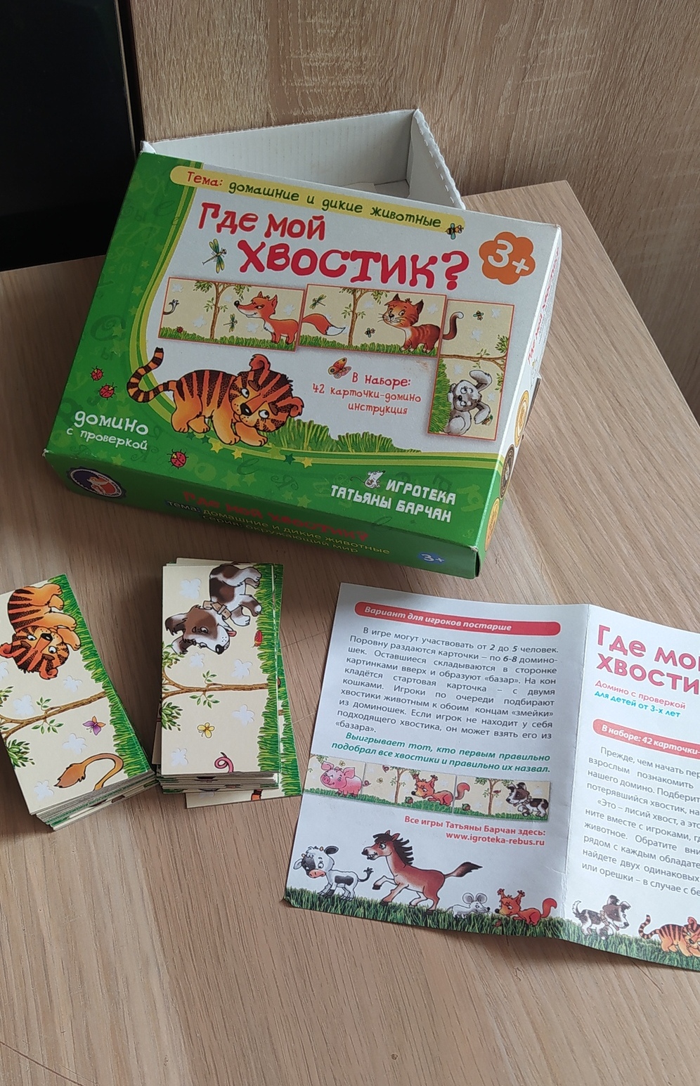 Игровое пособие "Где мой хвостик?" я приобрела для своего трехлетнего ребенка. Зрительно оценив изображение на коробке и прочитав краткую аннотацию, я пришла к выводу, что с помощью нее мы с малышом сможет изучить диких и домашних животных, расширить свои знания об окружающем мире и интересно провести досуг. Игра основана на принципе домино и адаптирована специально для маленьких.