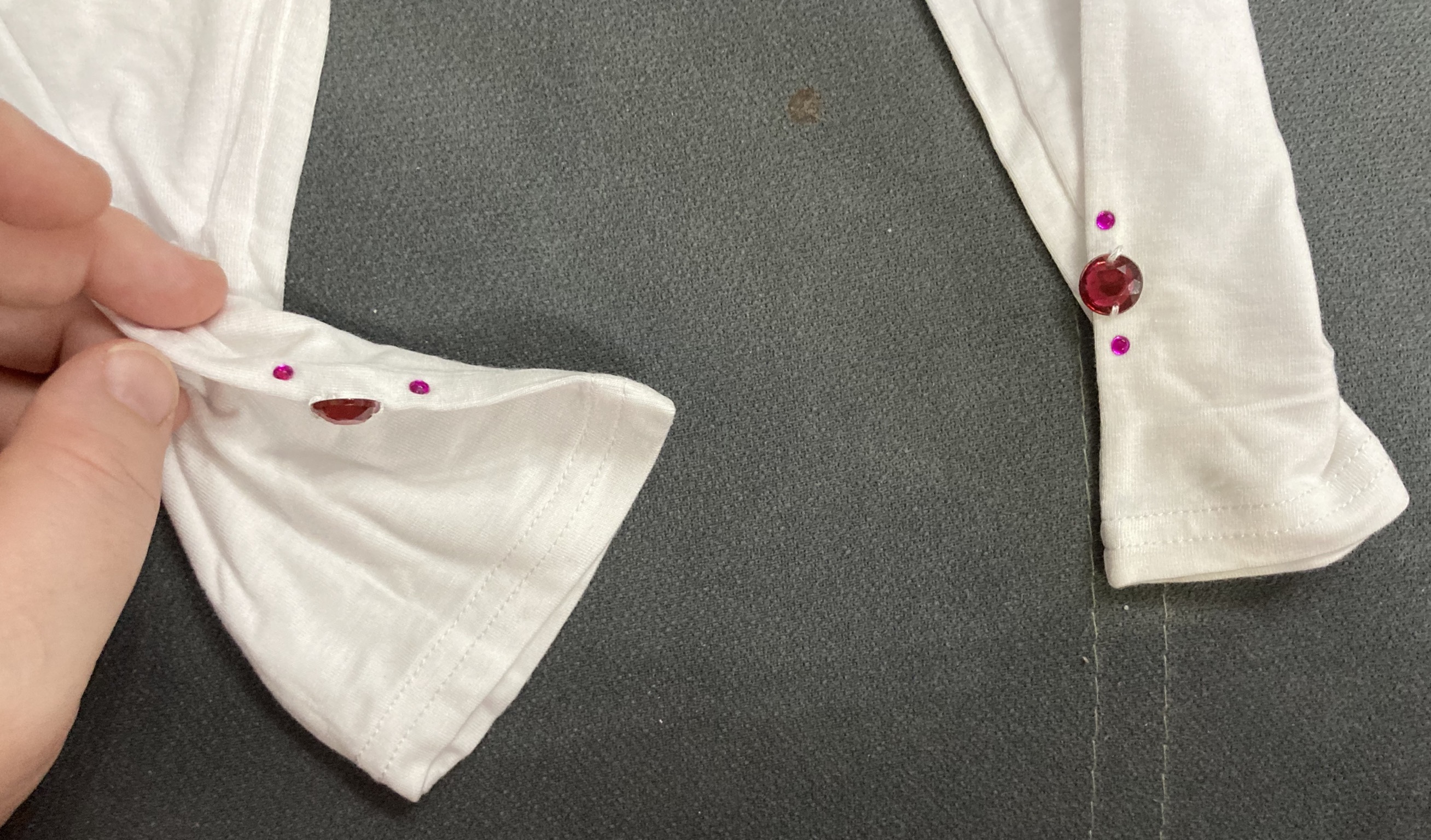 По бокам у леггинсов с обеих сторон располагаются малиновые стразы. Две маленькие стразины приклеены, одна большая по середине пришита белыми нитками.