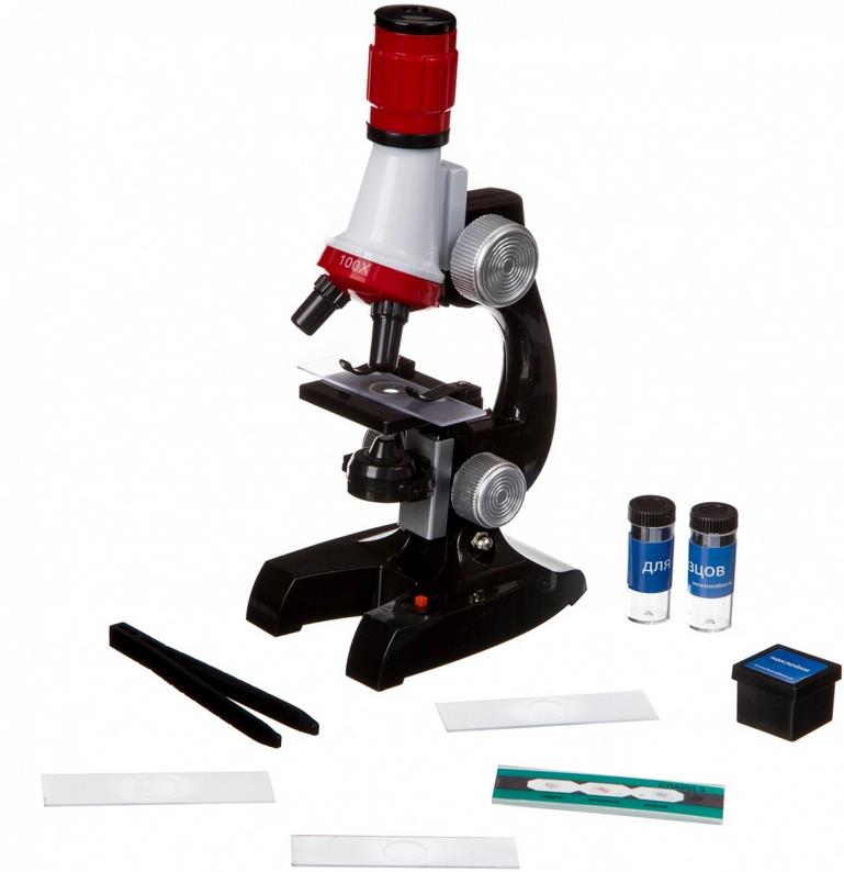 Микроскоп состоит из окуляра микроскопа, фокусирующего колеса, револьверного устройства, трёх объективов 100х, 400х, 1200х увеличение держателя для образца, предметного столика, подсветки, колеса регулировки, основания и защитной крышки окуляра. В набор также входят: 4 пустых предметных стекла, слайд с готовыми образцами, контейнер, наклейки для образцов, флаконы для образцов, пинцет.